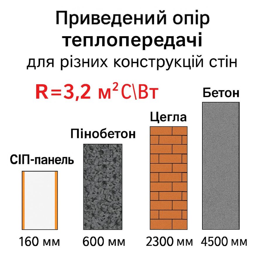 При товщині СІП-панелі 160 мм показник опору теплопередачі сягає R = 3,2–4,0 м²•°С/Вт. Це набагато вищий рівень, ніж у традиційних матеріалів, як-от цегла, газоблок чи керамзитобетон. Наприклад, щоб досягти аналогічного показника опору теплопередачі, стіна з газоблоку мала б бути майже вдвічі товстішою. А це додаткове навантаження на фундамент, більша витрата матеріалів та зменшення корисної площі.