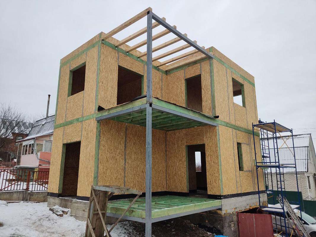 В большинстве частных проектов СИП-домокомплект отлично работает на деревянном брусе и жёсткой СИП-системе. Металл используется: